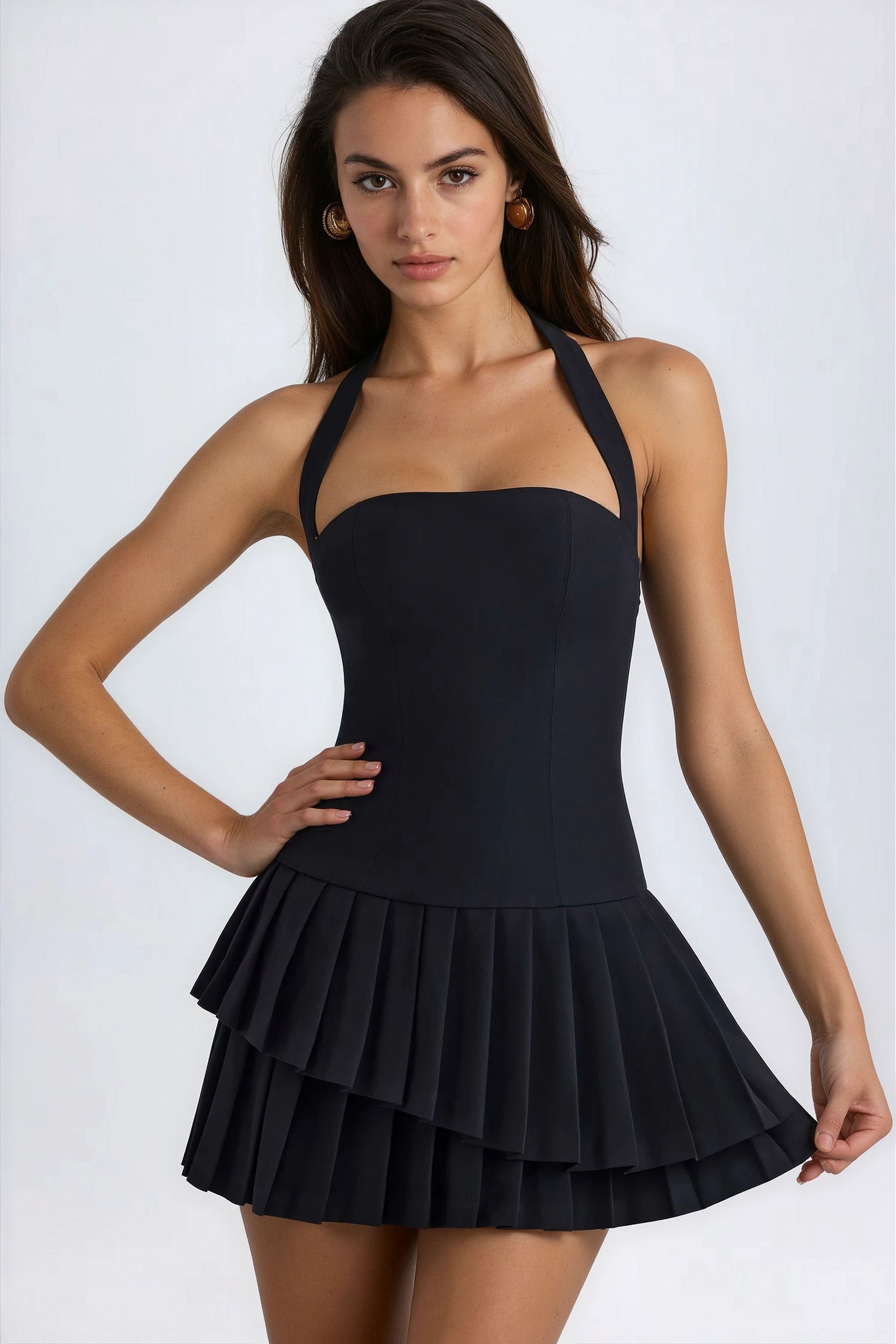 Crafted with precision. Designed to define and flatter your natural curves, the Rosaria mini dress is made from lightweight stretch-woven fabric in a classic halterneck style with a form-fitting drop-waist bodice. The dress is finished with a tiered, pleated skirt that moves beautifully with every step.