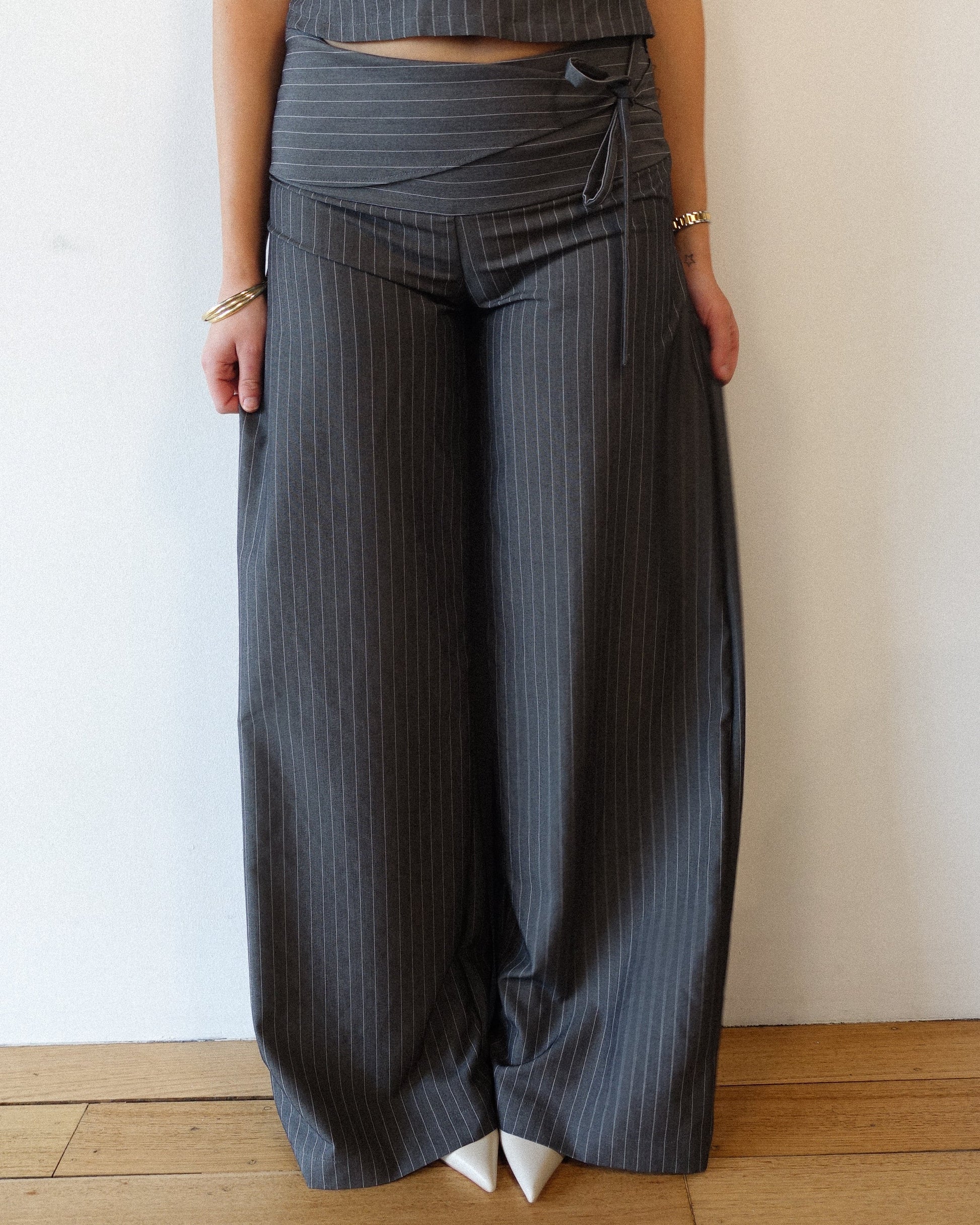 Designed with a sleek pinstripe pattern, these wide-leg trousers bring tailored energy with a modern twist. The highlight is the wrap-over waistband with a delicate tie, adding an elevated touch that flatters the waistline while keeping the silhouette relaxed.